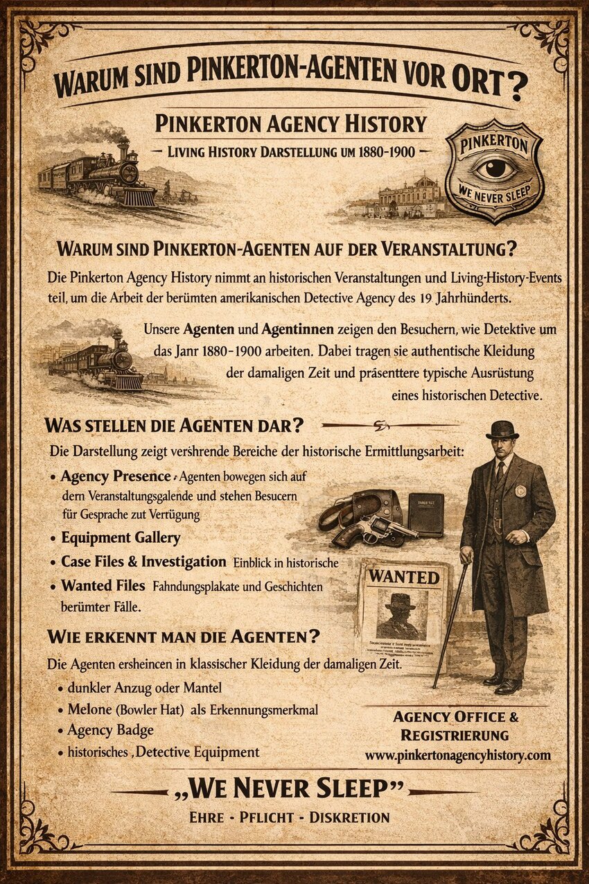 Der Gehrock mit Pinkerton Hut ist bei offiziellen Anlässen (kurzWaffe, Handschellen und Schrotflinten) zu tragen (bei Sitzungen, Einladungen usw.). Sie kann natürlich auch zu jedem anderen Anlass getragen werden.